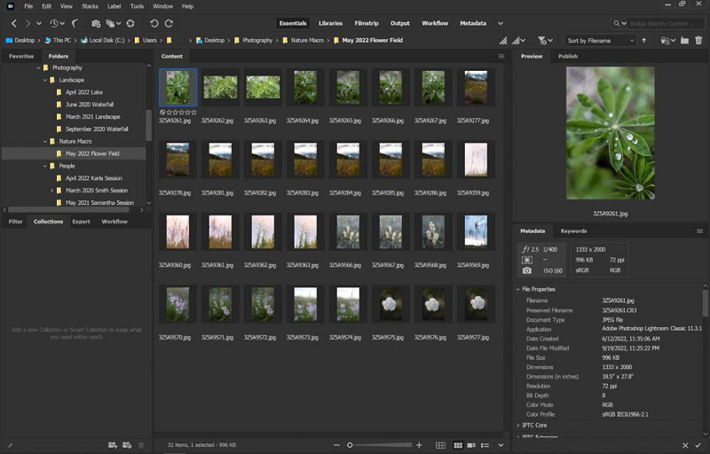 Sau khi đã tạo các danh mục, bạn có thể bắt đầu tìm kiếm và xem trước các tập tin của mình. Bạn có thể sử dụng thanh tìm kiếm để tìm kiếm các tập tin theo tên hoặc các thông tin khác. Ngoài ra, Adobe Bridge còn cung cấp nhiều chế độ xem trước khác nhau, cho phép bạn xem các tập tin hình ảnh của mình dưới nhiều dạng khác nhau, bao gồm xem trước toàn màn hình và chế độ xem trực quan.