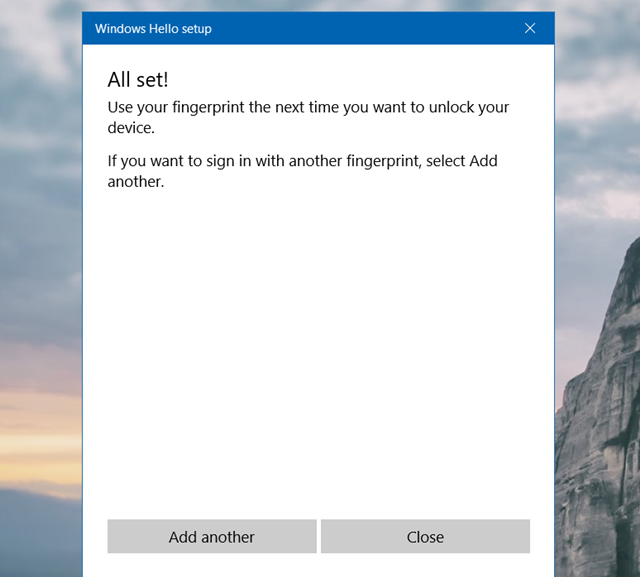 Tiếp theo người dùng cần phải làm để ngón tay của mình lên thiết bị quét dấu vân tay để chiếc máy có thể nhận diện vân tây ở nhiều góc độ tương tự như khi các bạn cài đặt dấu vân tay của mình ở trên smartphone. Khi cửa sổ “All set!” trên màn hình xuất hiện thì tức là bạn đã hoàn thành được công đoạn setup dấu vân tay của mình cho Windows 10. Và cuối cùng thì bạn đã hoàn thành được cài vân tay cho laptop dell bằng phần mềm. Chúc các bạn thực hiện thành công.