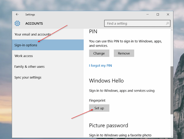 Sau khi người dùng đã thiết lập xong mã PIN thì bạn chọn vào mục Sign-in options rồi sau đó chọn đến Setup để có thể tiến hành cài đặt dấu vân tay cho Windows 10. Máy tính của các bạn nên được trang bị thêm thiết bị quét dấu vân tay cùng với Driver mới nhất để có thể hỗ trợ được Windows 10 và Windows Hello.