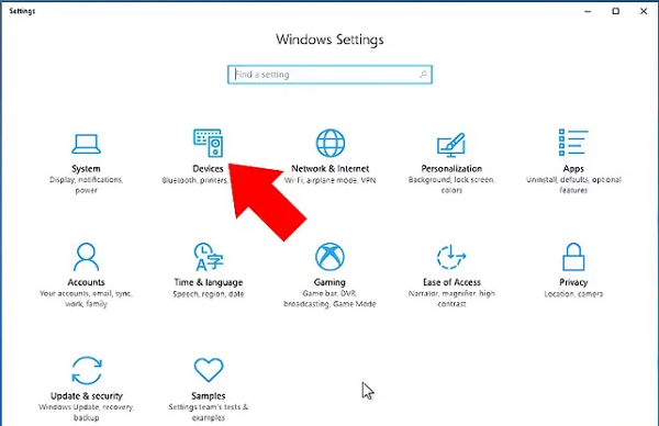 Bước 4 : Nhấp chọn vào Devices ( tùy chọn hình thiết bị ngoại vi ) nằm ở giữa trang Settings