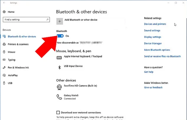 Bước 6 : Sau đó thì bạn nhấp vào công tác Bluetooth nếu như tính năng Bluetooth chưa được bật. Nút này nằm ở bên dưới tiêu đề Bluetooth gần ở đầu trang. Khi đó, công tác Bluetooth sẽ chuyển sang chế độ on