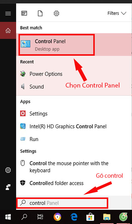 - Cách 2 : Nhập Control vào ô tìm kiếm ở Type here to search có hình chiếc kính lúp