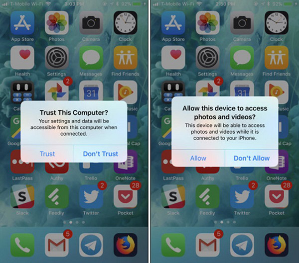 Kết nối iPhone với máy tính bằng với cáp Lightning-to-USB. Lần đầu tiên kết nối nó với máy tính, thì các bạn bạn sẽ thấy một cửa sổ bật lên một yêu cầu xác minh độ tin cậy để máy tính để truy cập tập tin, bao gồm ảnh và video. Chạm vào