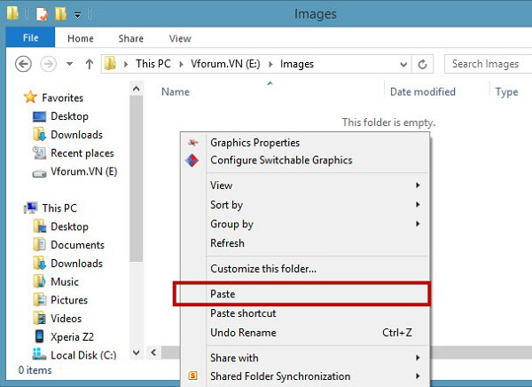 Click chuột phải vào chỗ trống của thư mục đó và chọn vào