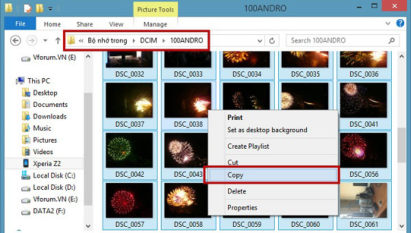 Sau khi đến được thư mục hình ảnh và video thì các bạn tiến hành chọn những file hình ảnh và video mà các bạn muốn copy vào máy tính, sau đó có thể nhấn tổ hợp phím