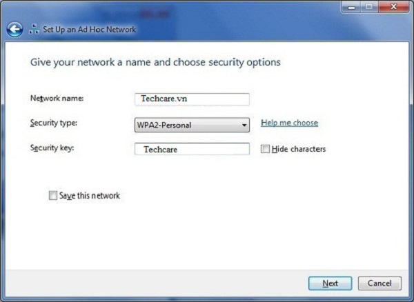 Bước 3 : Các bạn gõ tên của mạng vào ô Network name. Security type các bạn chọn là WPA2-Personal. Phần Security key các bạn nhập vào mật mã gia nhập mạng