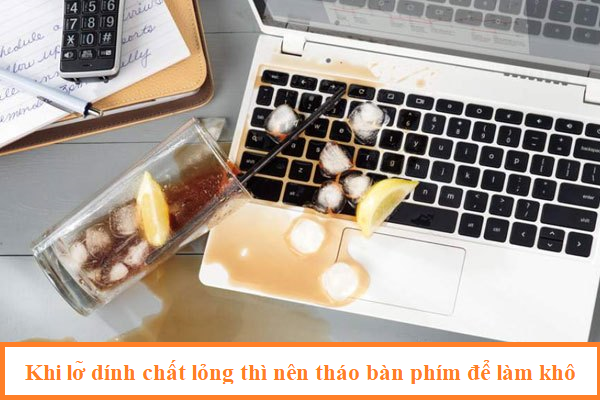 Đối với nước bị dính là chất lỏng thì bạn tháo bàn phím ra ngoài hay là các phím bằng cách sử dụng một ngón tay móc từ bên dưới cạnh của nút phím và nhẹ nhàng đẩy nó lên. Ngay sau đó là sử dụng cẩn thận một tăm bông để lau chùi chân phím và lắp nó lại vào chỗ cũ cuối cùng là kiểm tra hoạt động.