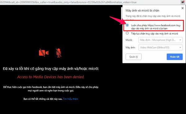 Bước 2 : Sau đó chọn vào mục Luôn cho phép Facebook truy cập Micro và máy ảnh của bạn -> sau đó nhấn vào Hoàn tất