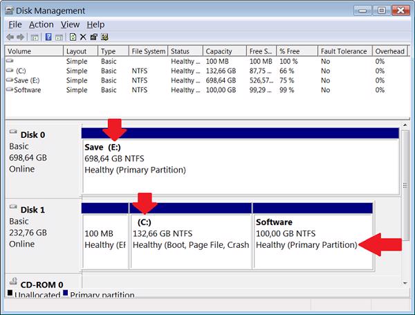 Như hình dưới đây, ngay lúc đầu ổ cứng của mình có cả 3 phân vùng (partitions). Nhưng sau khi cài hệ điều hành windows xong bị mất một ổ đĩa quan trọng và chỉ còn 2 ổ đĩa mặc dù khi cài hệ điều hành windows mình không xóa ổ đĩa đó đi
