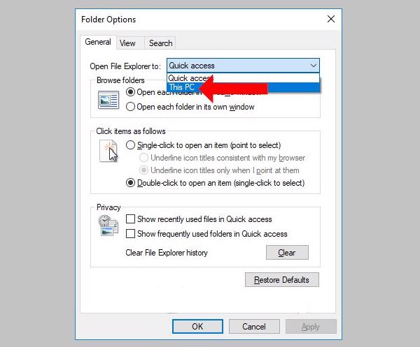 Bước 2 : Trong giao diện Folder Options xuất hiện, tại Open File Explorer to thì các bạn nhấp vào và chọn This PC. Sau đó nhấn vào Apply và Ok để lưu lại thay đổi