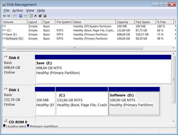 Bước 3 : Một cửa sổ mới sẽ hiện lên, tại đây các bạn sẽ thấy danh sách những ổ cứng và phân vùng ở trên máy tính. Như trên máy tính của mình có hai ổ cứng là Disk 0 và Disk 1 và các phân vùng là những ô xanh da trời nhưng đôi khi có những ô màu đen nữa. Thông thường thì mỗi máy tính chỉ có 1 cổng Disk 0, các thao tác với máy tính có một hay nhiều ổ cứng cũng đều giống nhau.