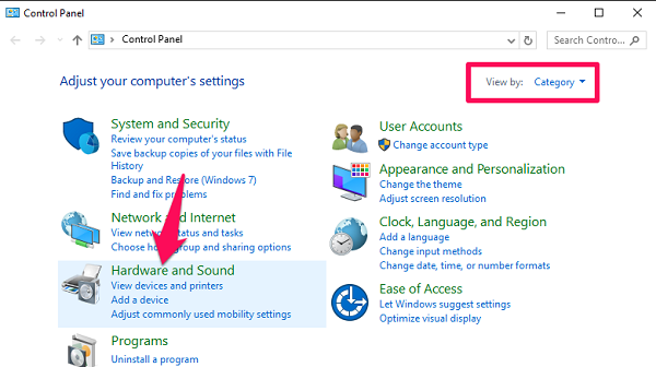 Bước 2: Sau đó chọn Hardware and Sound ( nên chú ý chế độ View by Category).