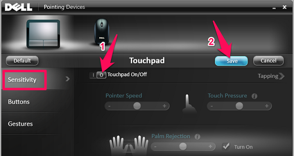 Bước 5: Cuối cùng bạn chọn tab Sensitivity sau đó thì các bạn gạt công tắc trong phần Touchpad On/Off sang phía bên phải (Off – màu đen). Rồi nhấn nút Save để có thể lưu lại thay đổi.