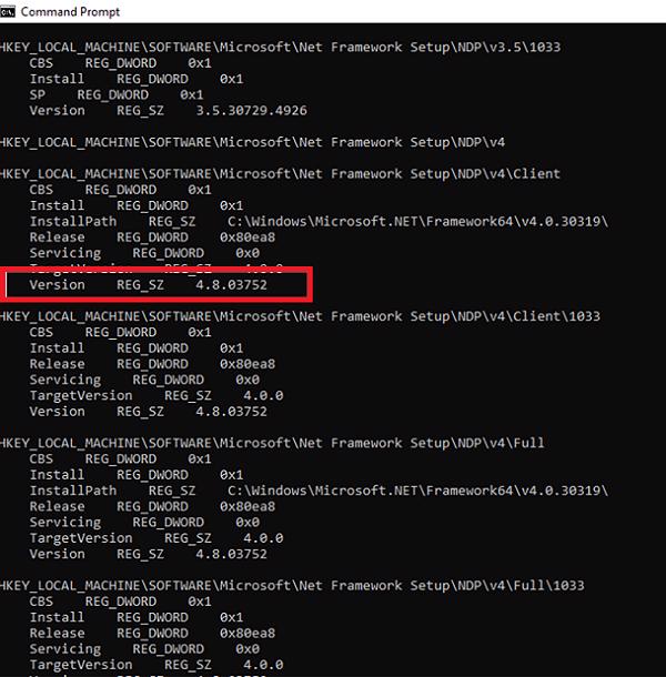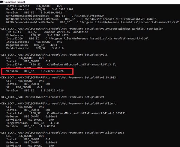 Lệnh trên sẽ hiển thị tất cả mọi phiên bản net framework đã cài trên máy tính của các bạn