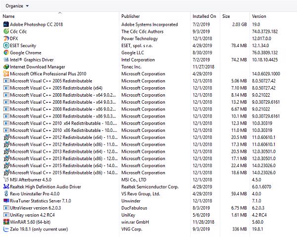 Bước 2 : Tại cửa sổ này thì các bạn sẽ thấy các danh sách ứng dụng và phần mềm được cài ở trong máy tính
