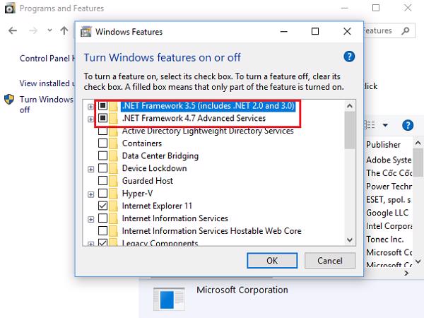 Kiểm tra net framework từ Control Panel với hệ điều hành windows 10