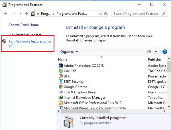 Bước 3 : Từ danh sách bên trái các bạn nhấn chọn vào mục Turn Windows features on or off.