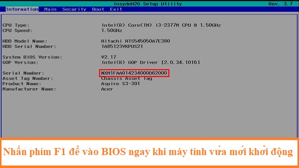 phím F1 để có thể truy cập vào BIOS của chiếc máy và tìm số serial laptop như ở dưới đây
