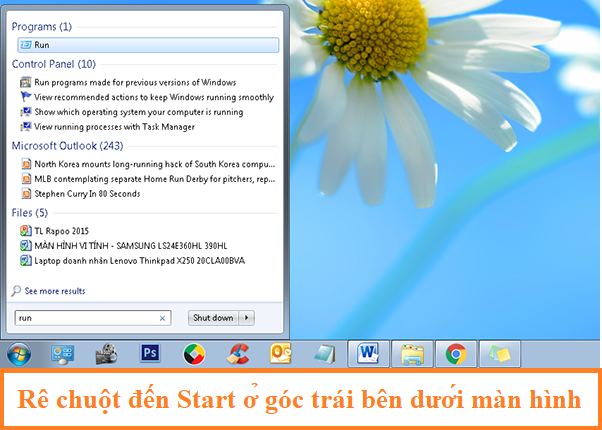Hay bạn cũng có thể vào mục Start bằng cách rê chuột đến biểu tượng ở góc trái bên dưới màn hình rồi tìm kiếm cửa sổ Run và gõ tiếp vào đó dòng