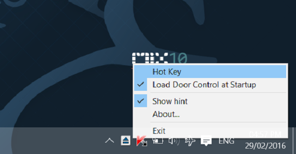 Để có thể kích hoạt phím tắt dùng để đóng và Eject hệ thống thì bạn hãy kích chuột bên phải vào biểu tượng Door Control ở trên khay hệ thống thông thường, rồi sau đó click chọn vào Hot key để mở được cửa sổ hộp thoại thông tin Door Control Hotkey.