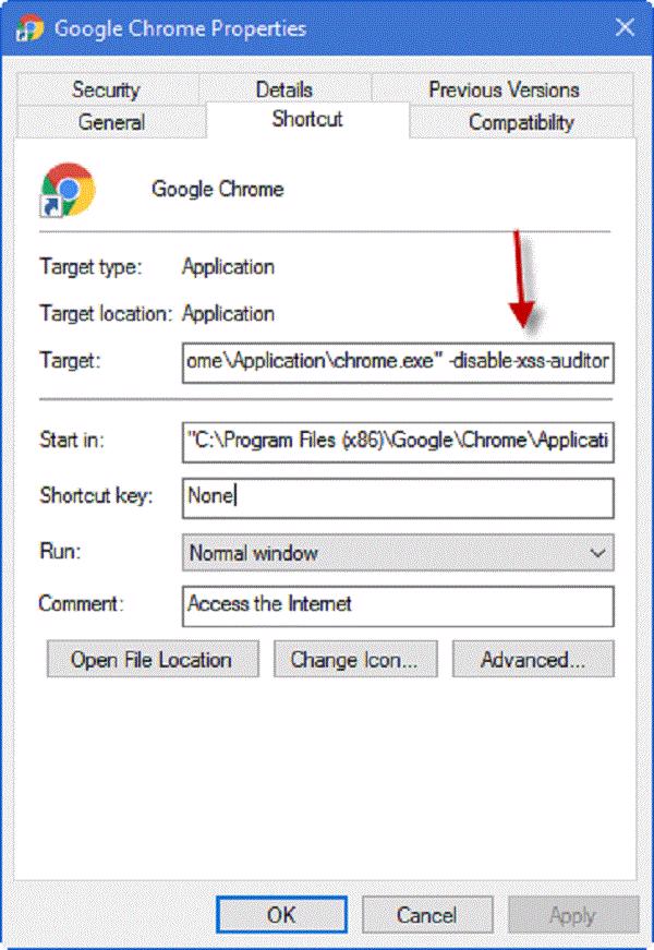 Trên trang thuộc tính, tìm đến dòng Target và thêm dòng này vào ở cuối dòng : -disable-xss-auditor. Khi các bạn thêm ở trên, Target đầy đủ sẽ là: