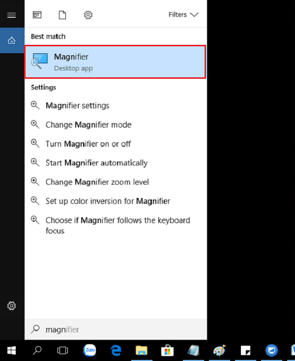Bạn có thể gõ trực tiếp vào từ khóa Magnifier ở trong hộp tìm kiếm của Menu Start