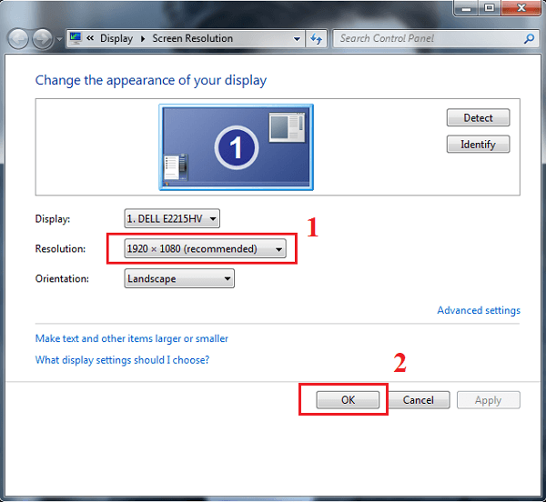 Bước 3: Tại mục Resolution các bạn chọn lại độ phân giải phù hợp ( recommended ) rồi nhấn vào OK để lưu lại thiết lập ở trên máy tính