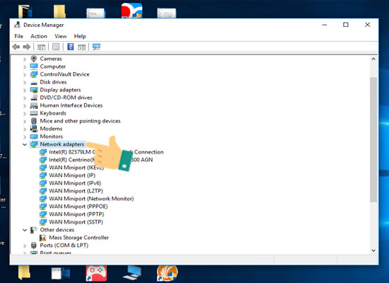 Bước 2: Giao diện Device Manager sẽ được mở ra và các bạn sẽ nhấp đúp vào Network adapters để có thể kiểm tra xem nó có biểu tượng là dấu chấm than có màu vàng hay không. Nếu như có biểu tượng là màu vàng thì khả năng là Driver WiFi chưa được các bạn cài đặt hoặc là thiết bị đó nhận Driver sai.
