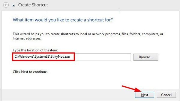 Tại đây thì các bạn chỉ nhập vào C:WindowsSystem32StikyNot.exe và tiếp tục nhấn vào Next để thực hiện