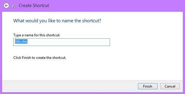Tiếp theo các bạn hãy nhập tên vào ô Type a name for this shortcut và nhấn vào Finish để kết thúc. Các bạn có thể điền với tên bất kỳ hoặc là để mặc định cũng được