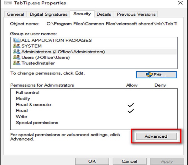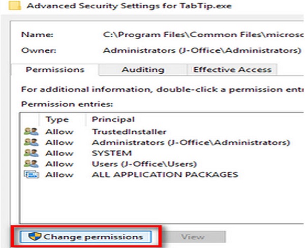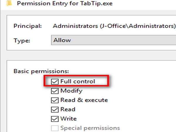 Tiếp theo nhấn vào Change permission ở bên dưới. Tiếp tục thì nhấn vào Full control để có thể kiểm soát được toàn bộ quyền thay đổi ở trên TabTip.exe