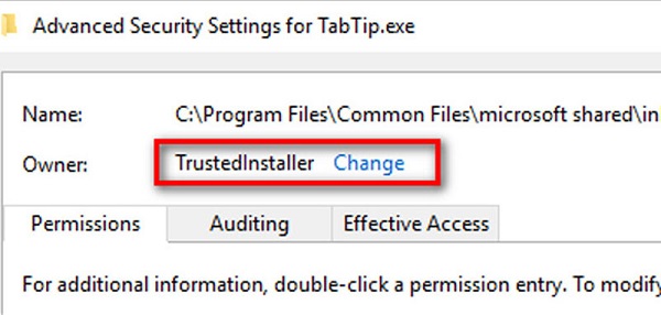Bước 4: Trong mục của Advacned Security Settings for TabTip và sau đó nhấn Change tại mục Owner. Lúc này thì chúng ta cần phải chuyển đến giá trị từ TrustedInstaller sang Administrator.