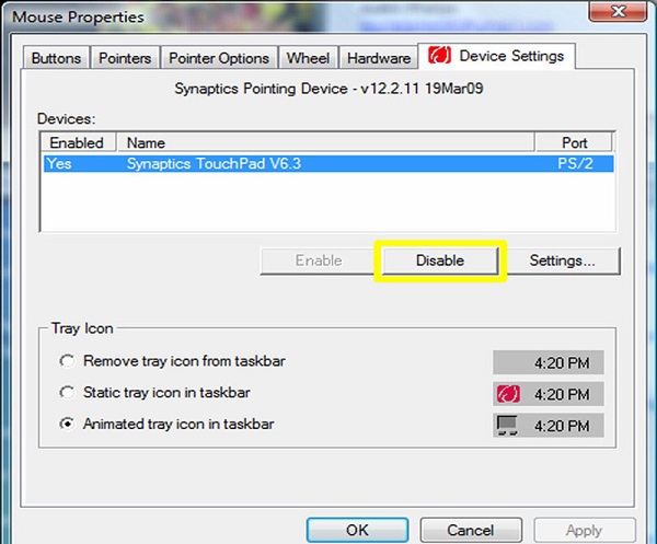 Các bạn sử dụng những phím chức năng có ghi ở trên phần bàn phím máy tính (Thông thường thì là Fn + F7), hoặc có thể tham khảo thêm những tài liệu kèm theo chiếc máy hoặc nếu không thì bạn có thể tìm thấy được biểu tượng của touchpad ở khay hệ thống (Hình bên dưới) sau đó thì bạn click đúp vào chuột hoặc chuột phải vào chọn vào Disable để mình tắt chúng đi.