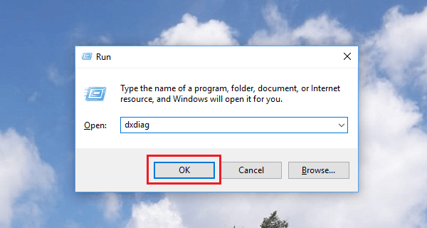 Bước 2 : Gõ dòng lệnh dxdiag và nhấn vào Ok hoặc là phím Enter để vào hộp thoại DirectX Diagnostic Tool