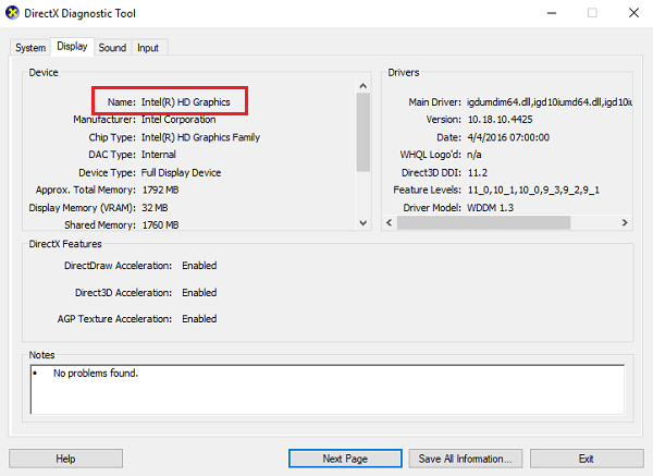 Bước 3 : Chọn tab Display để kiểm tra driver card màn hình và xem phần Name đầu tiên để biết tên card đồ họa đang dùng