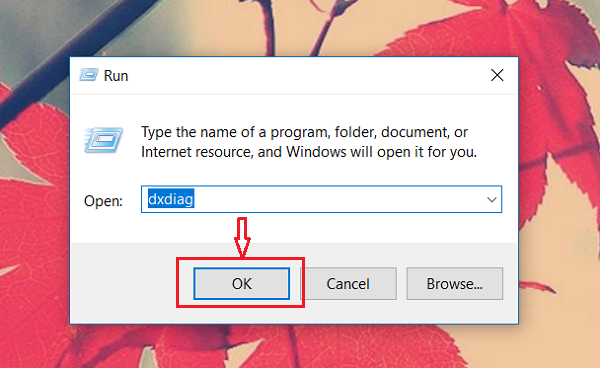 Bước 2 : Sau khi hộp thư thoại Run thì bạn nhập vào đó lệnh dxdiag rồi tiếp đến nhấn vào OK hoặc phím Enter.