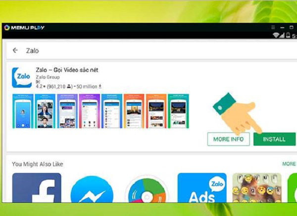 Bước 2 : Sau khi các bạn đã tải xong và cài đặt phần mềm giả lập này vào máy tính của mình thì các bạn hãy tiến hành vào cửa hàng Play Store như là hình minh họa và cài đặt zalo để tiến hành những bước xem nhật ký trên máy tính.