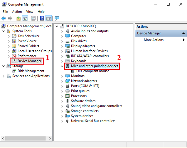 Bước 2 : Sau đó chọn Manage -> tiếp đến chọn vào mục Device Manager -> tiếp theo Mice and other pointing devices