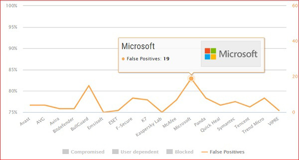 Nhưng Windows Defender có tỉ lệ nhận diện sai là khá cao so với những công cụ chống virus bên thứ 3, cụ thể là phần mềm này đã nhận diện sai ở 19 trường hợp trong bài kiểm tra.