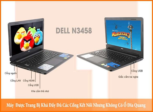 Dell N3458 được trang bị đầy đủ các cổng kết nối, bao gồm: cổng USB 2.0, cổng giao tiếp HDMI/VGA, jack cắm tai nghe, cổng USB 3.0 (cho tốc độ truyền tải nhanh).