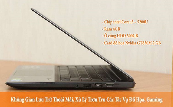 Cấu hình cao với chip xử lý core i5 – 5200U cùng card đồ họa rời NVIDIA GT830M với dung lượng 2 GB giúp máy chạy đa nhiệm mượt mà và khả năng xử lý các tác vụ đồ họa cũng như chơi gảm tốt.