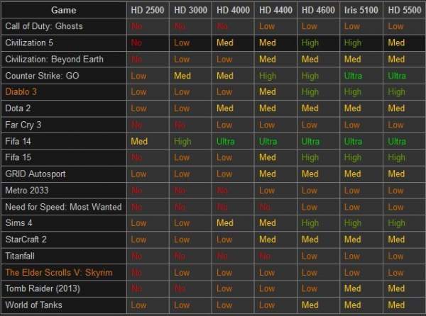 Để biết rõ hơn về loại card màn hình onboard của hãng Intel này có khả năng chơi được các tựa game gì thì các bạn theo dõi bảng minh họa dưới đây :