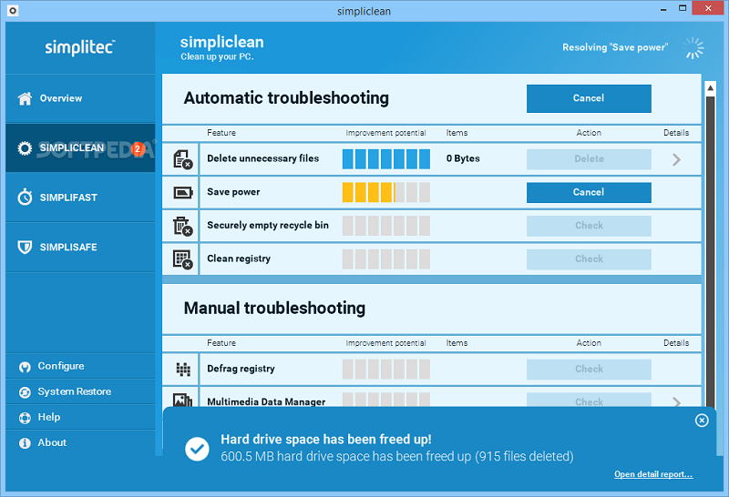 - Dọn dẹp : Chỉ với một lần bấm nút, Simpliclean bắt đầu dọn dẹp PC của bạn. Nó loại bỏ các tệp rác, dữ liệu tạm thời và các mảnh vụn kỹ thuật số khác có thể làm chậm hệ thống của bạn.