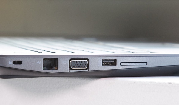 Bên trái của máy có 1 cổng USB 3.0 (kèm sạc), 1 cổng VGA, 1 cổng RJ-45, 1 khóa kensington và 1 đầu đọc thẻ nhớ SD.