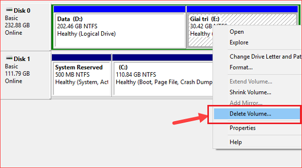 Để gộp hai phân vùng vào với nhau thì đầu tiên các bạn phải xóa phân vùng đi thì mới có thể gộp vào phân vùng mới. Lưu ý là trước khi xóa phân vùng thì các bạn hãy sao chép hết những dữ liệu quan trọng ở trong phân vùng sang nơi khác, nếu không sẽ mất dữ liệu.