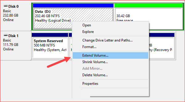 Bước 2 : Sau khi đã xóa xong phân vùng cần xóa thì các bạn hãy click chuột phải lên phân vùng mà mình muốn mở rộng và chọn vào Extend Volume