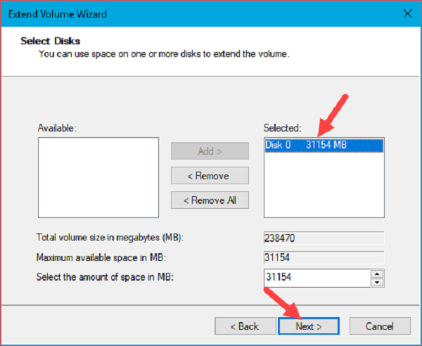 Bước 4 : Tiếp đến các bạn chọn dung lượng cần phải mở rộng và nhấn Next rồi sau đó nhấn Finish là xong