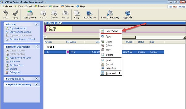 Bước 1 : Trên giao diện chính các bạn nhấp chuột vào phân vùng mà mình muốn chia hay gộp sau đó thì bấm vào Resize/Move.