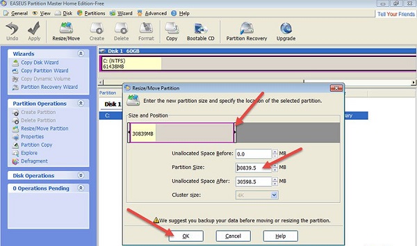 Bước 2 : Cửa sổ mới được hiện thì các bạn dùng chuột kéo thanh trượt co vào để có thể tạo ra vùng trống, bạn có thể nhập luôn dung lượng vào ô Partition Size phía dưới. Sau đó bạn chỉ việc bấm Ok để tách ổ đĩa.