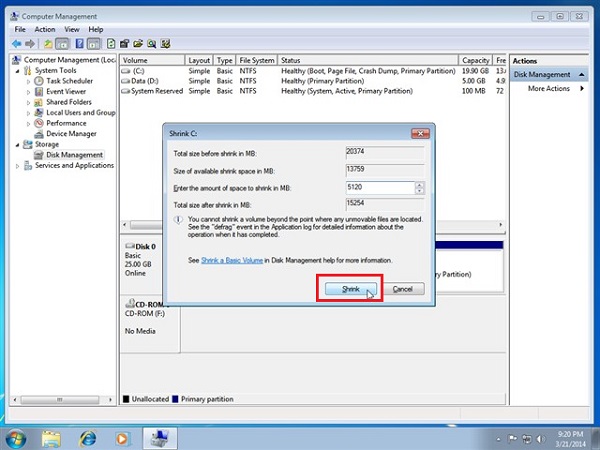 Bước 2 : Khi màn hình hiển thị cửa sổ mới thì các bạn hãy nhập vào dung lượng phân vùng muốn tách ra, con số có sẵn là dung lượng tối đa mà các bạn có thể tách rồi sau đó nhấn vào Shrink